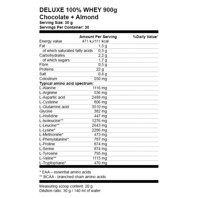 Deluxe Whey ще Ви осигури суроватъчен протеин, който е пълноценен протеин, усвояващ се бързо и лесно. С този протеин, вашето тяло ще получи 20 аминокиселини, чиято роля е да “поправят“ вашите кости, мускули, органи и почти всяка част и тъкан в човешкото тяло. Суроватъчния протеин съдържа всички 9 незаменими аминокиселини, които тялото Ви трябва да си осигури чрез диетата, заради което се смята за пълноценен протеин.